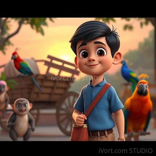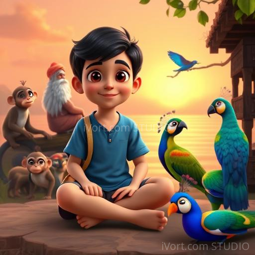 As the sun began to set, Aarav realized that the true magic of the island was its kindness and harmony. The animals and temples shared stories of love, respect, and sharing—values from India’s ancient traditions. Aarav understood that no matter where you go, kindness and respect make any place special. With a grateful heart, he promised to carry these lessons back to his village, sharing the magic of love and friendship with everyone he met.