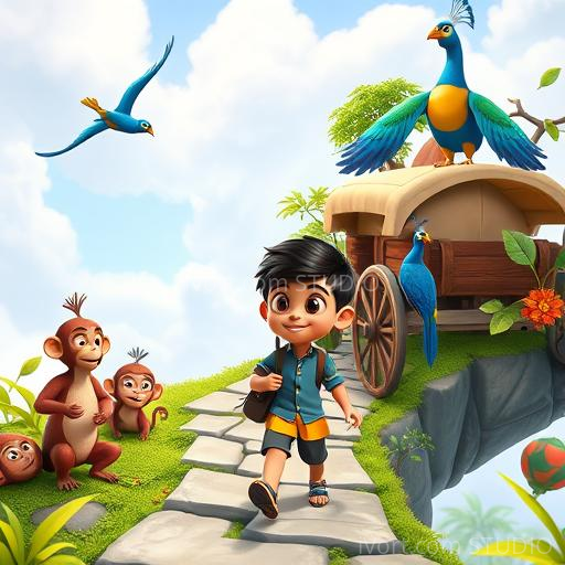 In a vibrant Indian village nestled between lush green fields and colorful markets, young Aarav gazed up at the sky with wide, curious eyes. One morning, he noticed a shimmering island floating high above the clouds, glowing with golden light and decorated with tiny, sparkling temples. His heart pounded with wonder—what could that mysterious island be? With a brave smile, Aarav decided to find out more about this magical place, dreaming of adventures beyond the ordinary.