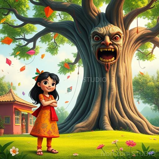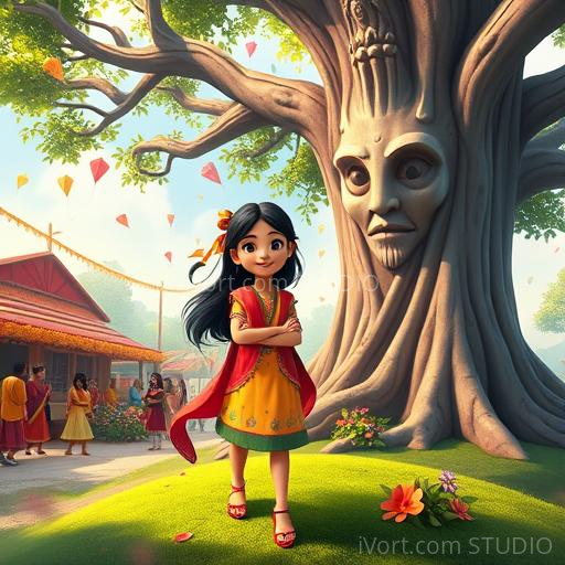 Zara found herself in a lush, ancient jungle filled with towering banyan and peepal trees. The trees seemed to whisper secrets of old India, their roots tangled like stories waiting to be told. Zara felt a mix of wonder and curiosity as she stepped carefully over mossy stones, listening to the gentle rustling of leaves. Suddenly, a wise old peepal tree, with a face carved in its trunk, spoke softly, 'Follow the path of the glowing flowers, and you will find your way.'