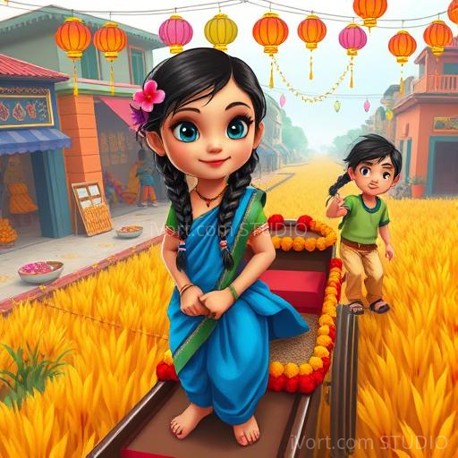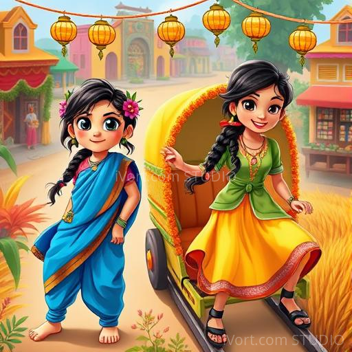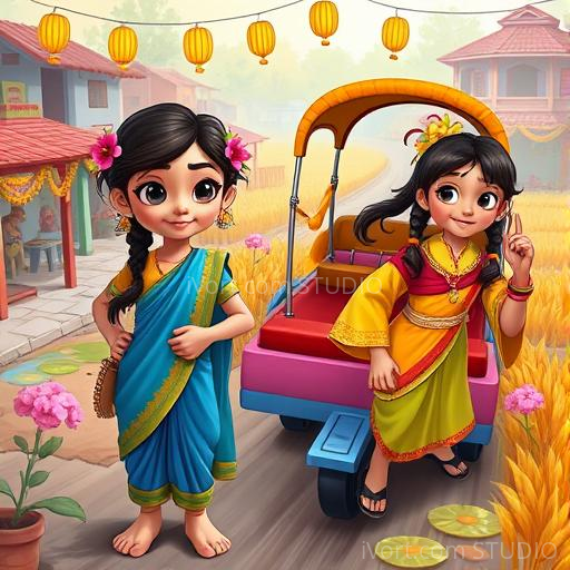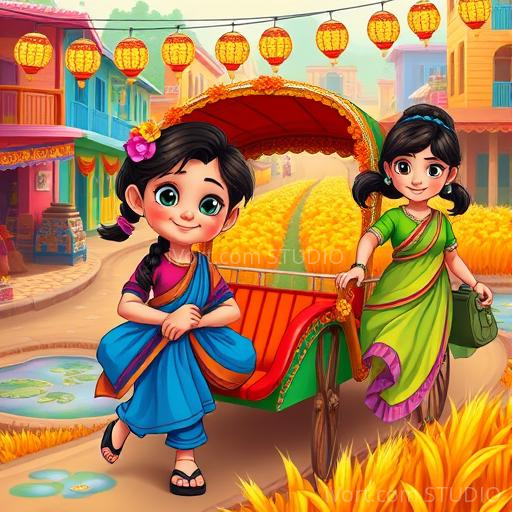 As night fell, the library soared higher and higher, shimmering under the moonlight like a floating palace of stories. Asha quickly ran to her friends, Ravi and Meera, and told them about the flying library. Together, they decided to follow it in a colorful rickshaw decorated with marigold garlands and bright patterns. The children felt a mix of awe and adventure as they zoomed through the village, past fields of golden wheat and shimmering ponds, eager to discover where the library was headed.