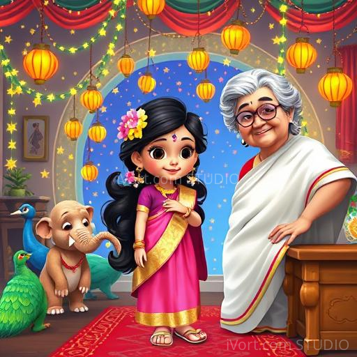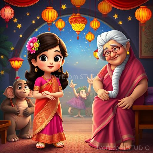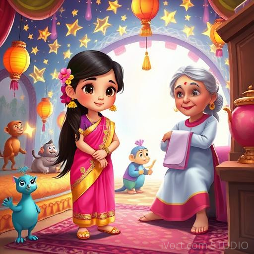 Anya stepped into the tunnel, and suddenly, she was in a wondrous place! The walls sparkled with tiny stars, and colorful lanterns hung from the ceiling, casting a warm glow. She saw friendly animals wearing bright saris and dhotis—peacocks, monkeys, and even a wise old elephant. They welcomed her with cheerful smiles, inviting her to explore this enchanted Indian land filled with music, dance, and delicious smells of spices and sweets. Anya felt happy and brave, ready for her new adventure.