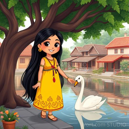 In a peaceful Indian village nestled between lush green fields and a shimmering river, young Anika loved exploring. One hot afternoon, she wandered beneath the grand, ancient banyan tree, its roots twisting like a giant's fingers. Suddenly, she noticed a shimmering white feather floating down. Curious, she looked up and saw a graceful swan gliding silently across the river, its feathers shining like pearls. Anika wondered why such a beautiful bird was so far from its usual home. Her heart filled with wonder and a tiny bit of worry—what was the swan doing here?