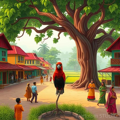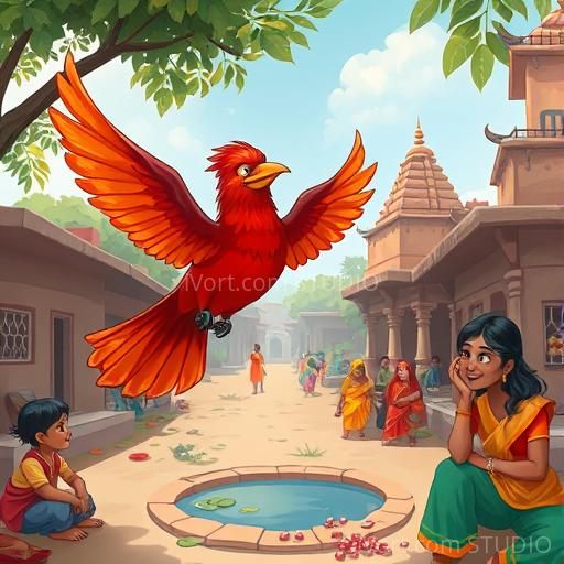 In a vibrant Indian village nestled between lush green fields and colorful houses, there lived a curious red crow named Kavi. Unlike other crows, Kavi's feathers shimmered like rubies under the bright sun. One morning, Kavi noticed something strange — all the other birds were whispering about a mysterious glowing object deep in the banyan tree. Filled with curiosity and a tiny bit of nervousness, Kavi decided to find out what it was. As he flapped his wings excitedly, he wondered if this adventure would bring him a new friend or a new lesson.