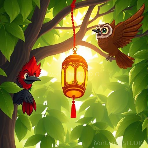 Kavi fluttered closer to the banyan tree, its leaves whispering secrets in the breeze. As he reached the thick branches, he saw a tiny, glowing lantern hanging from a branch, flickering softly like a firefly. The lantern was decorated with tiny mirrors and colorful beads, shining with a gentle light. Kavi’s eyes widened with wonder. Just then, a wise old owl named Gyan swooped down and said, 'That lantern is special — it’s a gift from the village festival, meant to bring happiness. But it’s lost now. Would you help find its owner?' Kavi nodded eagerly, feeling proud to be part of something important.