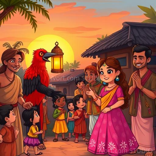 Kavi gently handed the lantern to Meera, who clapped her hands with delight. She thanked Kavi and promised to keep the lantern safe. As the sun set, casting a golden glow over the village, Kavi felt a warm glow in his heart. He had learned that helping others brings happiness not just to them, but also to oneself. The villagers gathered around, praising Kavi’s bravery and kindness. From that day, the red crow became a little hero in the village, reminding everyone that even small acts of kindness can light up the world like a shining lantern.