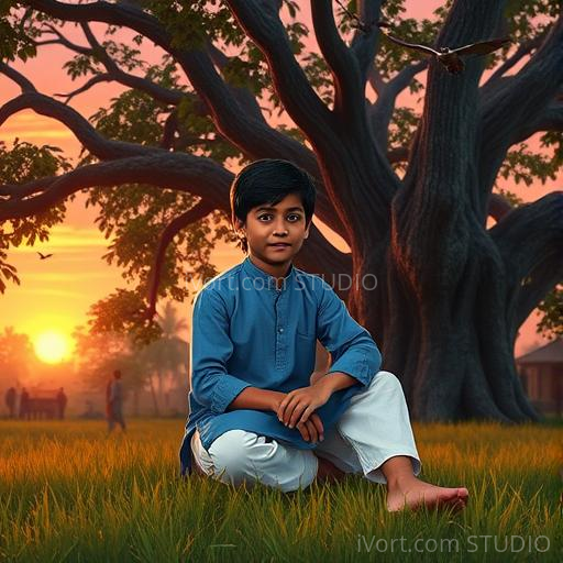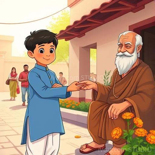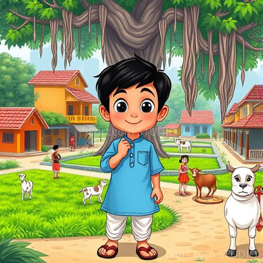 In a vibrant Indian village nestled between lush green fields and colorful houses, young Kannan loved to explore. One sunny morning, he found a shiny, mysterious coin near the banyan tree. Curious, he wondered if he should keep it or find its owner. As he pondered, a gentle breeze rustled the leaves, whispering secrets of honesty and trust. Kannan decided to seek the owner, feeling a warm glow in his heart, knowing that honesty is always the best path.