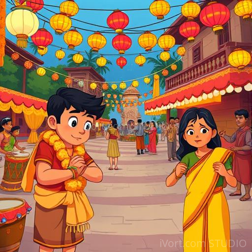 Later that day, Kannan met his friend Meena, who was upset. She had lost her favorite bracelet during the village festival. Kannan remembered the coin and wondered—could it be connected? As he looked around, he saw the festival decorations—bright marigold garlands, colorful lanterns, and joyful music filling the air. Kannan felt a tug in his heart. Should he keep the coin and forget about the bracelet, or do what’s right? With a deep breath, he decided to find out the truth.