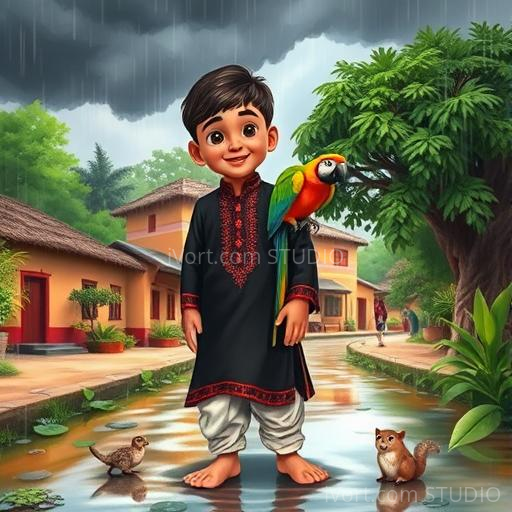 One monsoon morning in a vibrant Indian village, Ravi, a curious boy with bright eyes and a cheerful smile, notices dark clouds gathering overhead. Suddenly, the rain begins to pour heavily, turning the village streets into shimmering streams. Ravi’s pet parrot, Mithu, flutters nervously, seeking shelter. Ravi feels a pang of worry—how will everyone stay dry and safe in this sudden storm?