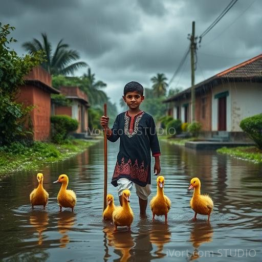 As Ravi continues his rescue, he hears a faint cry from a small boat caught in a flooded street. It’s a family of ducks, their tiny ducklings stranded and scared. Ravi quickly finds a sturdy stick and carefully guides the ducks to a safe patch of dry land, making sure everyone is safe and sound. The ducks quack happily, and Ravi feels proud of his kindness.