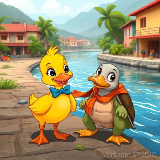 In a lively Indian village by a shimmering river, a curious little duck named Chirpy loved exploring every nook and cranny. One sunny morning, Chirpy found himself stuck in a tangled mess of reeds near the water’s edge. Feeling worried, he wondered how he could free himself. Just then, a kind old turtle named Guru, wearing a tiny saffron scarf, waddled by and saw Chirpy struggling. With gentle patience, Guru helped Chirpy untangle his feathers. Chirpy looked up with bright eyes and chirped a heartfelt 'Thank you!'—a simple word that made everyone smile. Chirpy realized that saying thank you was a small gesture that could brighten someone’s day, just like the warm Indian sun.
