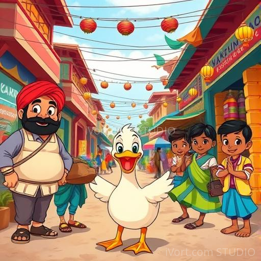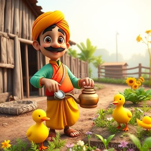 Later that day, Chirpy wanted to thank the farmer who had given him a handful of rice earlier. The farmer, wearing a colorful kurta and a broad smile, was watering his plants with a brass pot. Chirpy waddled over and gently quacked, 'Thank you for the rice!' The farmer chuckled warmly and patted Chirpy’s head. Chirpy felt proud and happy—he learned that gratitude is a magic that spreads kindness all around. From that day, Chirpy made it a habit to say thank you to everyone who helped him, making his village a happier place.