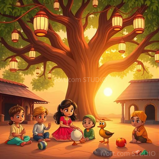 That evening, as the sun dipped behind the distant hills, Chirpy noticed a group of children playing near the banyan tree, their laughter ringing through the air. One little girl, dressed in a bright pink lehenga, accidentally stepped on Chirpy’s tail. Chirpy felt a tiny pinch but looked up kindly and said, 'Thank you for playing with me and being gentle.' The girl smiled brightly and said, 'Thank you, Chirpy!' Chirpy realized that saying thank you even when someone makes a small mistake helps everyone stay happy and kind. From then on, Chirpy made sure to thank everyone, spreading love and gratitude in his village.
