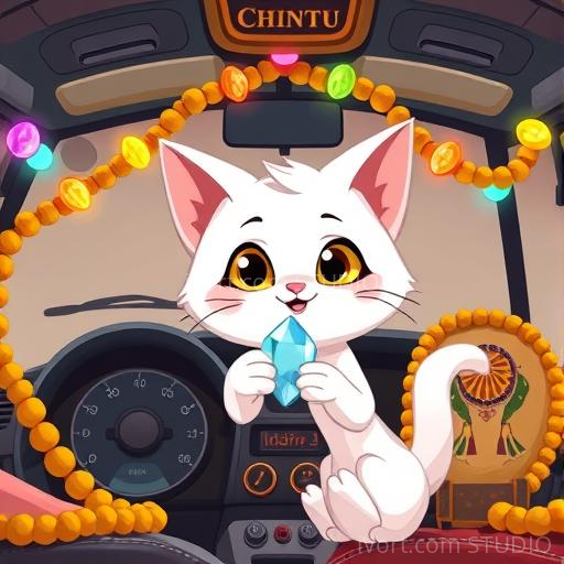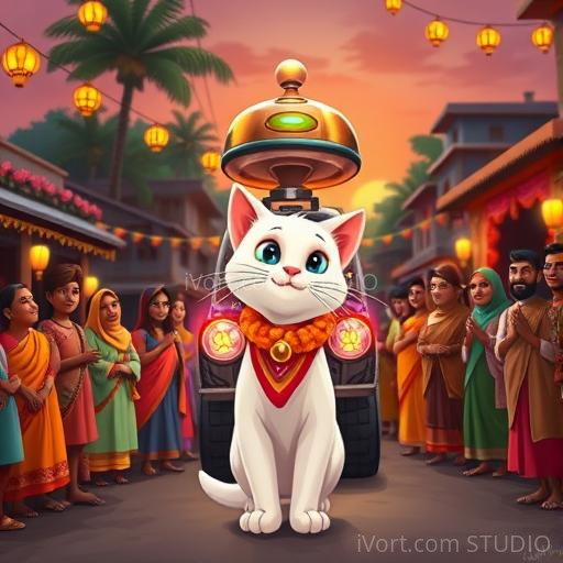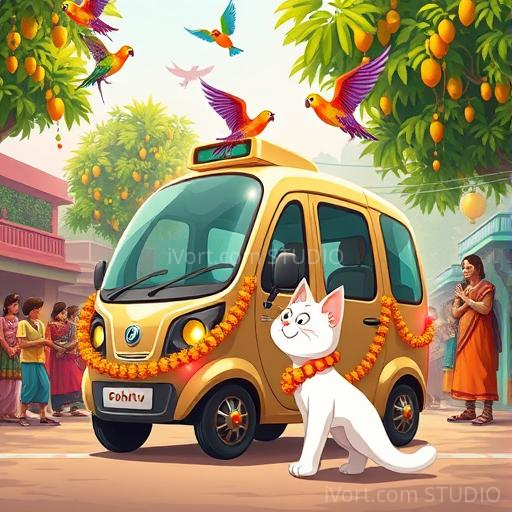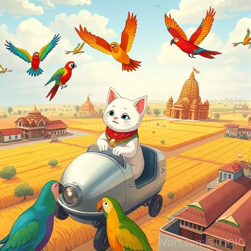 In a bustling Indian village, a curious white cat named Chintu loved to explore. One bright morning, Chintu discovered a shiny, floating robotaxi parked near the mango trees. The robotaxi sparkled with colorful lights, and its doors opened with a gentle hiss. Chintu’s whiskers twitched with excitement—what adventures awaited inside? But suddenly, the robotaxi’s engine flickered and stopped! Chintu felt a tiny flutter of worry. Would he be able to help the robotaxi fly again and explore the sky?