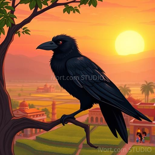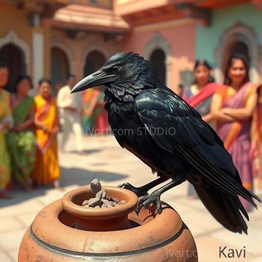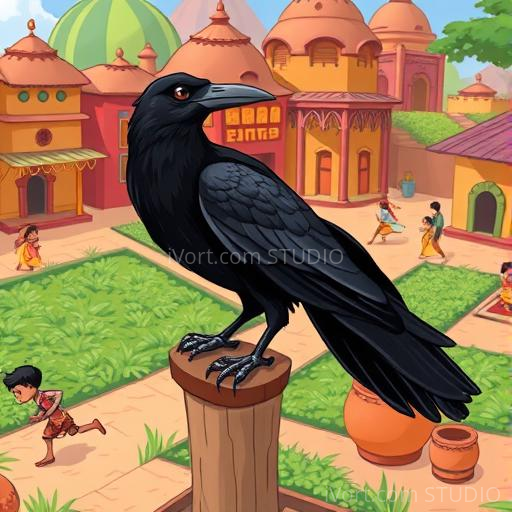 In a vibrant Indian village nestled between lush green fields and colorful houses, there lived a clever black crow named Kavi. One hot summer day, Kavi felt very thirsty after a long flight. He looked around and saw a small clay pot with a tiny amount of water at the bottom. But the water was too low for him to reach. Kavi’s eyes sparkled with curiosity and determination. He wondered how he could drink the water without knocking over the pot. His mind was full of ideas, and he decided to think smartly to solve his problem.