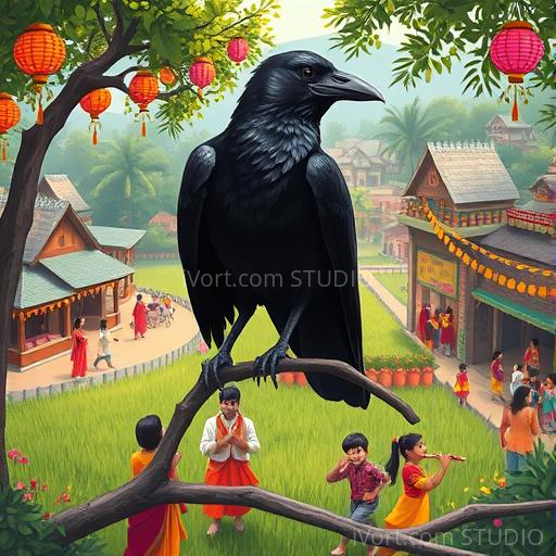 Feeling refreshed, Kavi looked around and saw a group of children playing nearby. They were celebrating a festival with colorful lanterns, music, and dancing. Inspired by the joy and unity, Kavi realized that cleverness and kindness could bring happiness not just to himself but to everyone around. He decided to share his story of quick thinking with the children, who clapped and cheered for the smart crow. Kavi felt proud and happy, knowing he had used his intelligence for good.