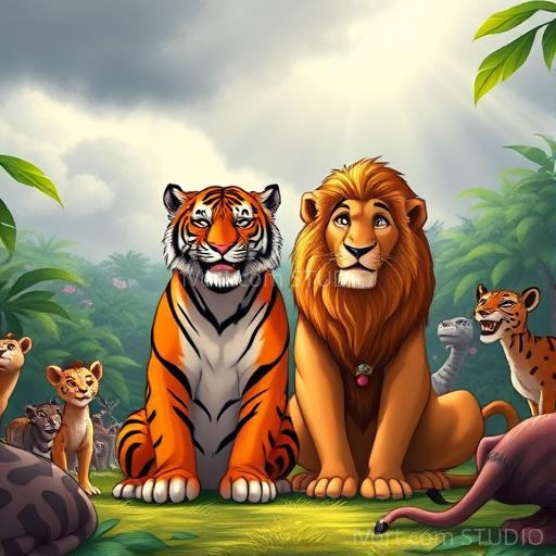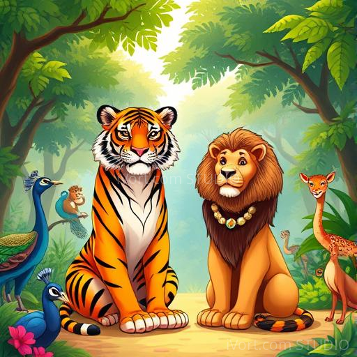 In the heart of India’s lush forests, two mighty animals, a tiger named Sheru and a lion named Simba, often wondered who was truly the king of the jungle. One sunny morning, they decided to settle the question with a friendly challenge. Sheru, with his bright orange coat and black stripes, roared confidently, while Simba, with his golden mane and brave eyes, purred softly, ready for the adventure. As they prepared, the jungle animals gathered, curious about who would win the title of the true king.