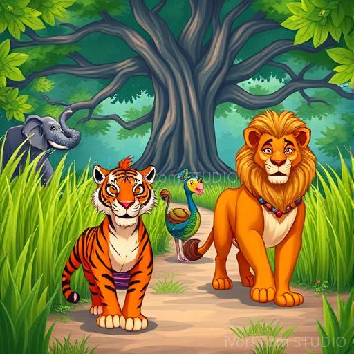 Sheru and Simba set off on their challenge, each eager to prove their strength. Sheru prowled through the tall grass, his sharp eyes scanning for the fastest way to reach the ancient banyan tree. Simba, proud and brave, marched through the forest, his golden mane shining in the sunlight. Along the way, they met wise old animals—an elephant, a peacock, and a wise turtle—who gave them advice about kindness, courage, and sharing the jungle’s beauty.