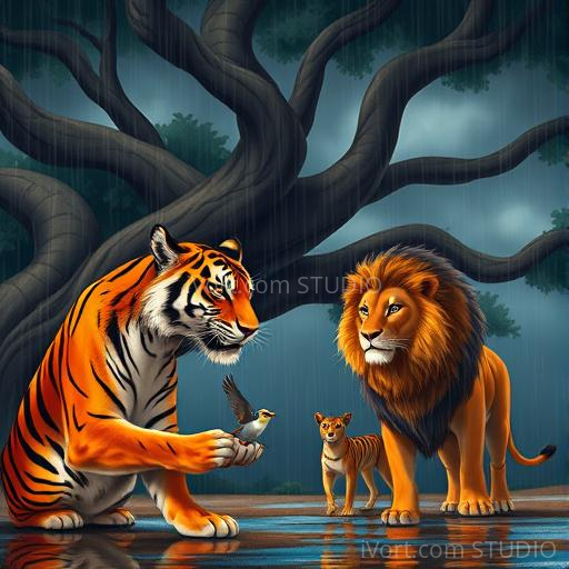 As they reached the ancient banyan tree, they faced a sudden storm. The wind howled, and the rain poured down. Sheru saw a tiny bird trapped in a broken nest and quickly helped it to safety. Simba saw a group of young animals lost and guided them back to their families. In that moment, both realized that being brave and caring for others made a true king—not just strength or roar, but kindness and compassion.