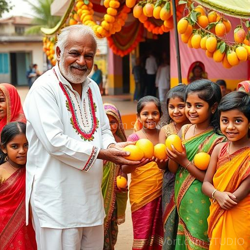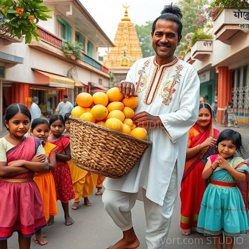 In a bustling Indian village, there was a small roadside stall where Ramu, a clever mango seller, displayed his ripe, golden mangoes. One hot summer day, a group of children gathered, eyeing the juicy fruits but hesitating to buy because they thought the prices were high. Ramu noticed their worried faces and smiled softly. He decided to share his secret to making everyone happy and his mangoes fly off the stall!
