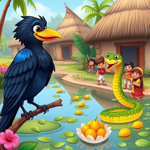 In a lush Indian village, near a sparkling pond surrounded by mango trees, lived a clever crow named Kavi. One hot afternoon, Kavi noticed a shiny, juicy mango hanging from a branch. As he admired the fruit, a sneaky snake named Saanp slithered nearby, eyeing the mango greedily. Saanp hissed softly, thinking of how delicious the mango would be for his lunch. Kavi, quick-witted and calm, decided to find a clever way to protect the mango and teach Saanp a lesson about greed.