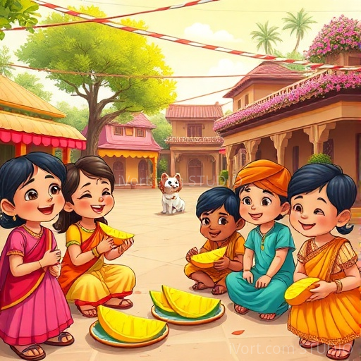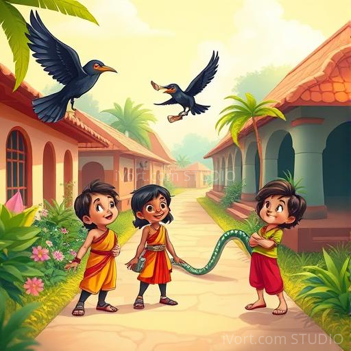 Kavi flapped his wings and called out loudly, pretending to carry an important message from the village elders. He told Saanp that a special feast was waiting at the far end of the village, and he needed to deliver the message quickly. Saanp, eager for a feast, slithered away eagerly, forgetting about the mango. As Saanp disappeared into the distance, Kavi and Mitthu quickly swooped down and gently took the mango, sharing it happily among the village children who gathered nearby.