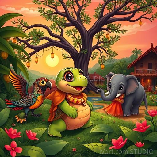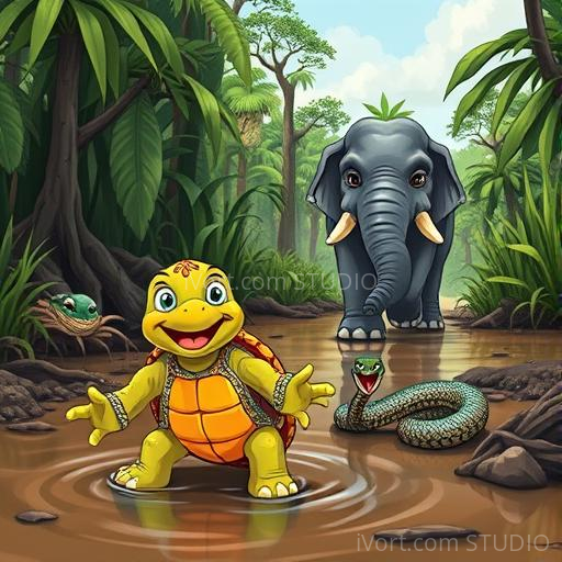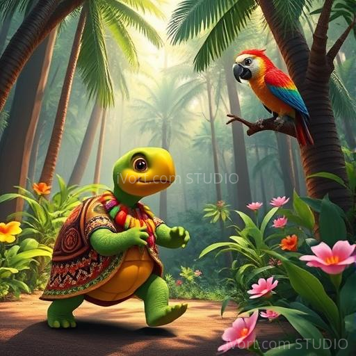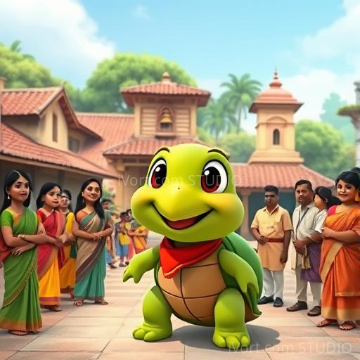 In a vibrant Indian village nestled between lush green fields and colorful houses, there lived a cheerful turtle named Tinku. Tinku loved to chat with everyone—birds, cows, children, even the peacocks that danced in the temple courtyard. One sunny morning, Tinku overheard a group of villagers talking about a hidden treasure deep inside the jungle. Excited and curious, Tinku decided to find it, but his endless talking soon caused trouble.