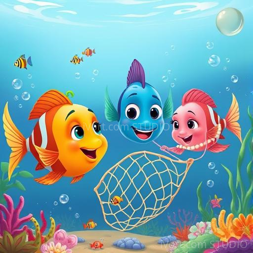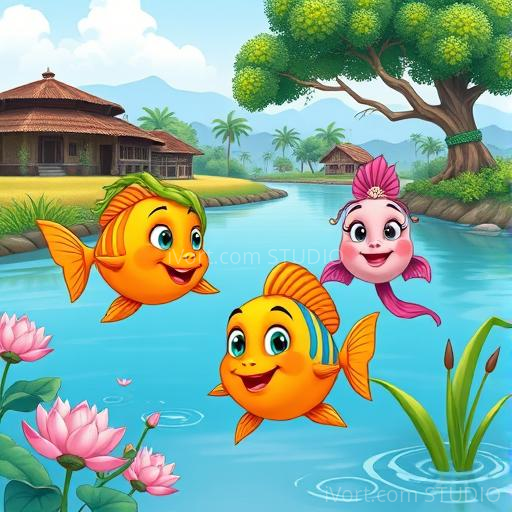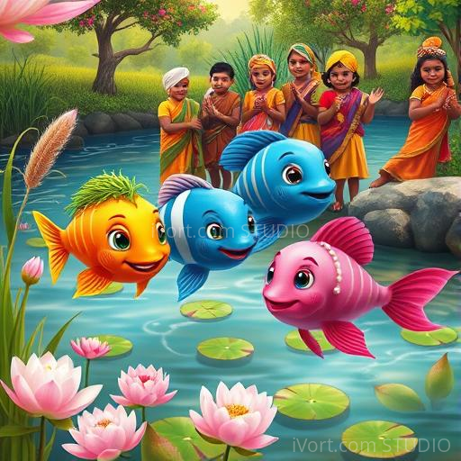 In a peaceful Indian village by a shimmering river, three colorful fish named Chintu, Bittu, and Lali loved to play among the lotus flowers and reeds. One bright morning, Chintu noticed something strange—a faint, almost invisible net stretched across the water, blending with the water lilies. Curious and a little worried, the three friends wondered what it was and why it was there. They decided to find out together, feeling brave and full of hope to protect their home.