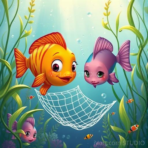 As the fish swam closer, they saw that the net was made of fine, almost invisible threads, woven carefully among the water plants. Lali, the wisest of the three, gently touched the net with her fin and exclaimed, 'This looks like a trap! Someone might be trying to catch us or other fish.' The friends felt a mix of fear and determination. They knew they had to warn their fellow creatures and find a way to keep their home safe from harm.
