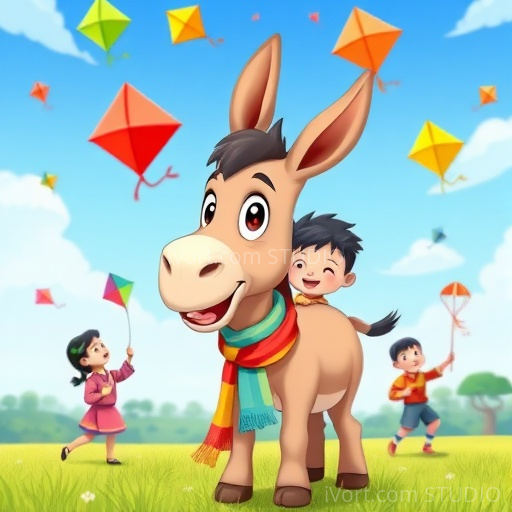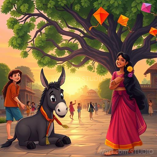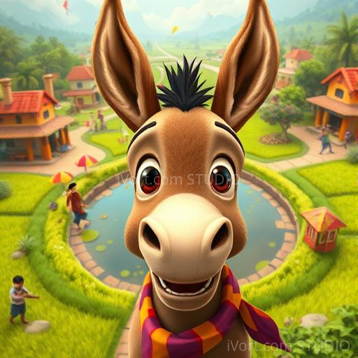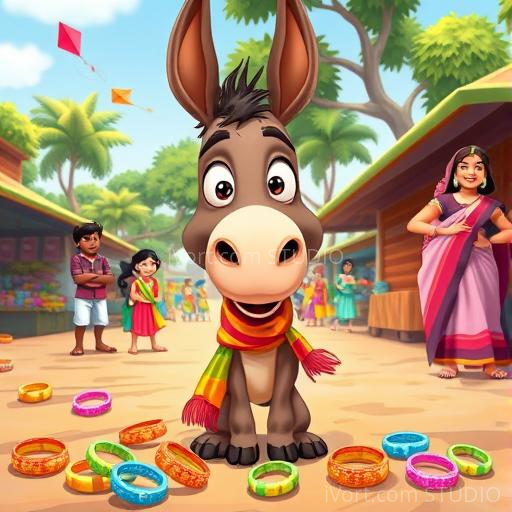 Once upon a time, in a lively Indian village surrounded by lush green fields and colorful houses, there lived a donkey named Golu. Golu was known for being a little foolish because he often did silly things without thinking. One hot summer day, Golu saw a shiny, bright object near the village pond and became very curious. 'What is that sparkling thing?' he wondered, his big eyes wide with wonder. Little did he know, this curiosity would lead him on a funny adventure that taught him an important lesson about thinking before acting.
