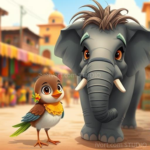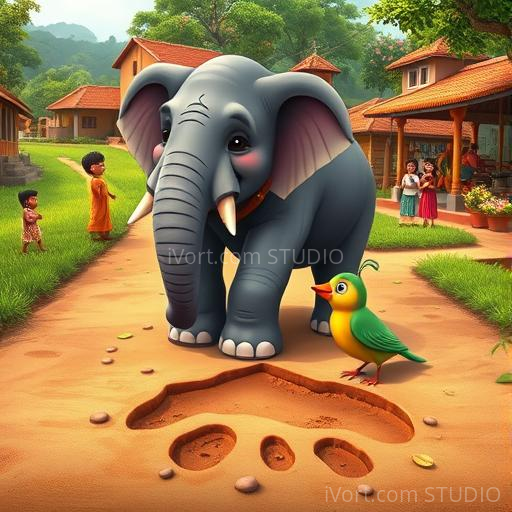 In a lively Indian village nestled between lush green fields and colorful markets, a tiny sparrow named Chikki was curious about everything. One morning, she noticed a big, gentle elephant named Gaja walking past her tree. Gaja’s enormous foot had left a deep footprint in the soft earth, and Chikki wondered what it would be like to be that big. She decided to find out if she could learn from Gaja and maybe even help him someday. Her tiny heart was filled with excitement and a little bit of nervousness as she fluttered closer.