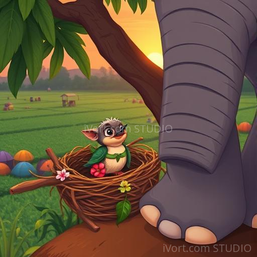 That evening, Chikki found a cozy corner in a big mango tree. She built a tiny nest, decorated with soft feathers and tiny flowers. As she settled in, she looked at Gaja’s massive foot resting nearby, like a gentle giant watching over her. Gaja gently lifted his foot and placed it near the tree, making sure no one was hurt. Chikki realized that even though they were different in size, they shared a special bond of friendship and kindness. She chirped happily, feeling safe and loved, knowing that small friends and big friends can work together to make the world a better place.