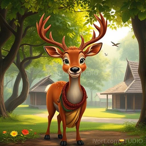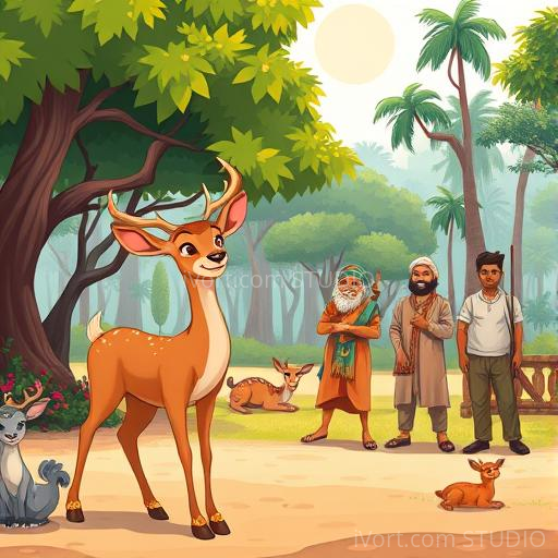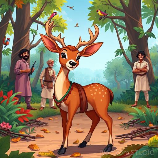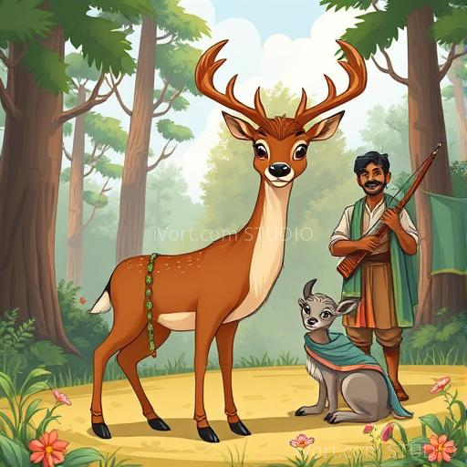In a lush green Indian forest near a vibrant village, there lived a clever deer named Raju. One day, the villagers set a trap to catch the deer, hoping to protect their crops. Raju noticed the trap early and felt worried but decided to think quickly. He remembered the stories his grandmother told him about wisdom and kindness. With a gentle smile, Raju devised a plan to outsmart the hunters without hurting anyone. His heart was full of hope and courage as he prepared to face the challenge.