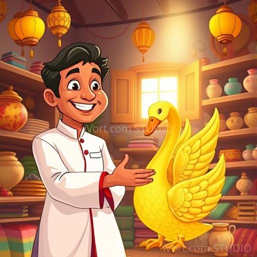 In a bustling Indian village, there lived a kind merchant named Ramu who loved collecting rare and beautiful things. One sunny morning, while exploring a hidden corner of his shop, he discovered a shimmering golden swan statue. Curious and excited, Ramu wondered if this magical bird could bring him good luck. But as he reached out to touch it, the swan suddenly fluttered its golden wings and came to life, surprising Ramu! The swan whispered, 'I am a enchanted guardian, and I need your help to find my true home.' Ramu felt a mix of wonder and responsibility, realizing that a new adventure was about to begin.