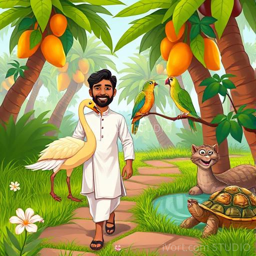 The golden swan explained that it belonged to a beautiful lake deep in the Indian jungle, where many magical creatures lived. But the lake had lost its sparkle because a mischievous monkey had hidden the sacred pearl that kept the water pure. Ramu decided to help the swan find the pearl. Together, they set off through lush green fields, colorful flowers, and tall mango trees. Along the way, they met a cheerful parrot who gave them clues and a wise old turtle who shared stories of the jungle’s secrets. Ramu felt brave and hopeful, eager to restore the magic to the lake and see the golden swan fly free again.