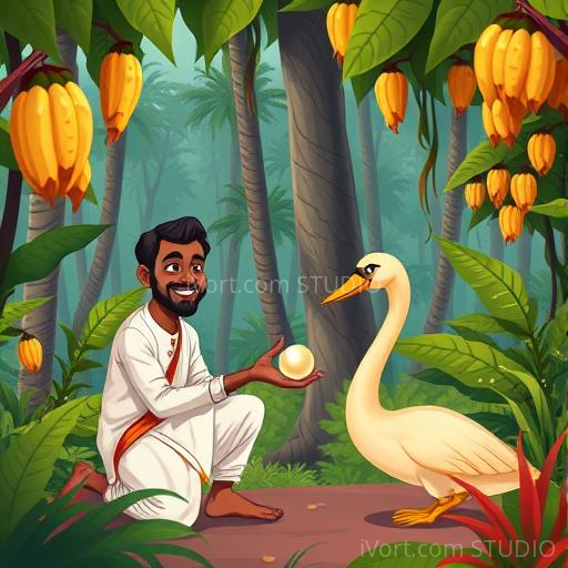 Deep in the jungle, Ramu and the swan found the mischievous monkey swinging from tree to tree. The monkey was playful but tricky, hiding the sacred pearl behind a cluster of bananas. Ramu gently asked the monkey to return the pearl, explaining how important it was for the lake and all the creatures living there. The monkey, feeling guilty, handed over the pearl with a big smile. Ramu and the swan thanked him kindly. With the pearl in hand, they hurried back to the lake, feeling happy and proud of their teamwork and honesty.