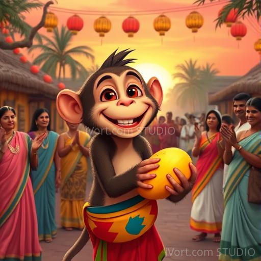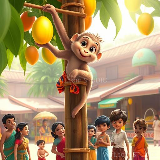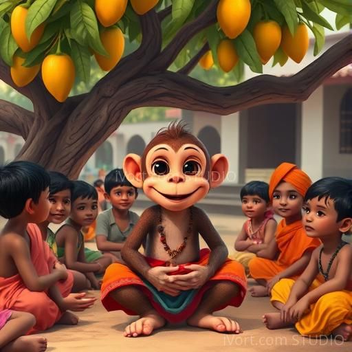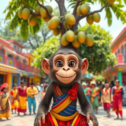 In a lively Indian village, a mischievous monkey named Chiku loved mangoes more than anything. One sunny morning, he heard about the biggest, juiciest mango hanging from the tallest tree in the village square. Chiku’s eyes sparkled with curiosity. But how could he reach such a high mango? He decided to go on a fun adventure to find a way to get it, feeling excited and a little nervous about the challenge ahead.