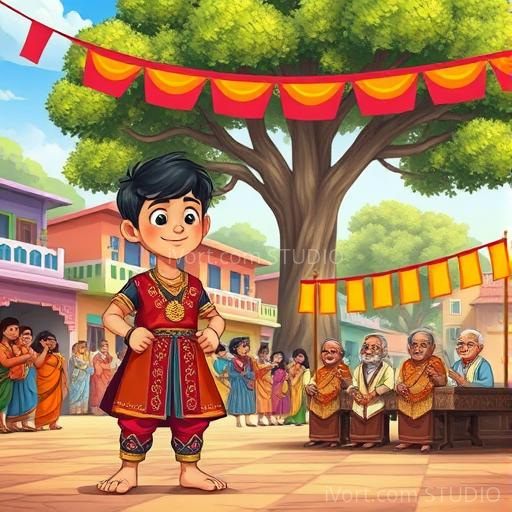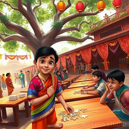 In the vibrant village of Banaraspur, little Raju loved to dream big. One day, he heard about the upcoming village competition—an event filled with singing, dancing, and clever puzzles. Raju felt a spark of curiosity and excitement, but also a little nervous. He wondered if he could do it, especially since he struggled with some of the tasks. Yet, deep inside, he decided to try his best to win a special prize that could bring happiness to everyone in his village.