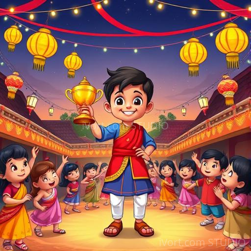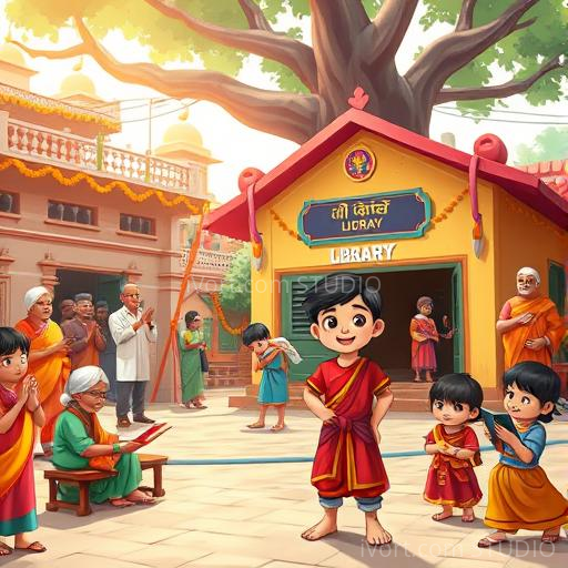 As the festival continued, Raju received a special prize—a beautiful new library for the village, filled with books about adventures, science, and stories from India. Raju realized that winning was not just about the prize, but about believing in himself and never giving up. His victory inspired everyone in Banaraspur to chase their dreams, no matter how big or small. Raju learned that with courage and perseverance, even the smallest hero can bring great happiness to their village.
