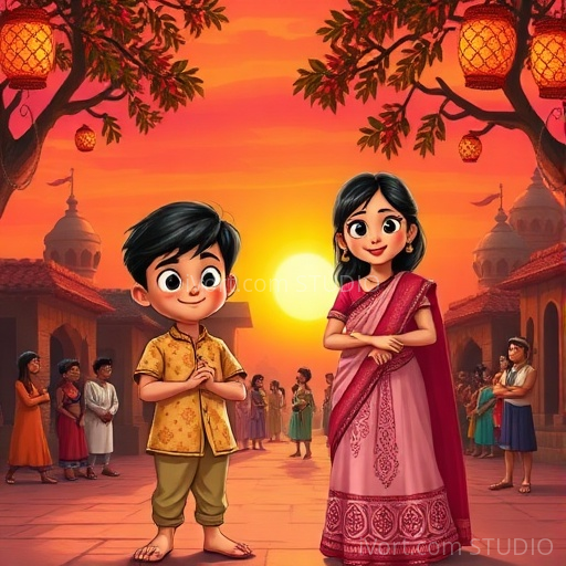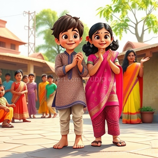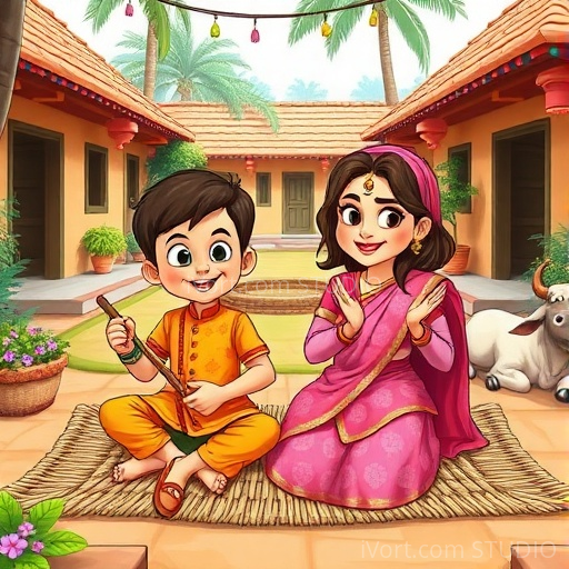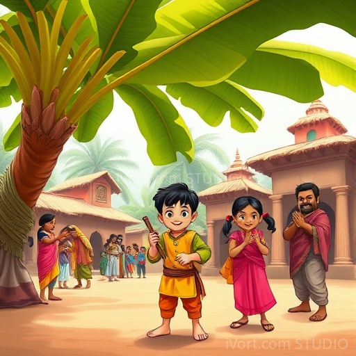 In a lively Indian village, young Burbal loved to surprise everyone with his clever tricks. One sunny morning, he found a ripe banana hanging from a tree, but he wondered—how could he make it disappear just like magic? His curious eyes sparkled as he thought of a fun plan to amaze his friends and family.