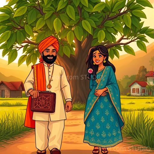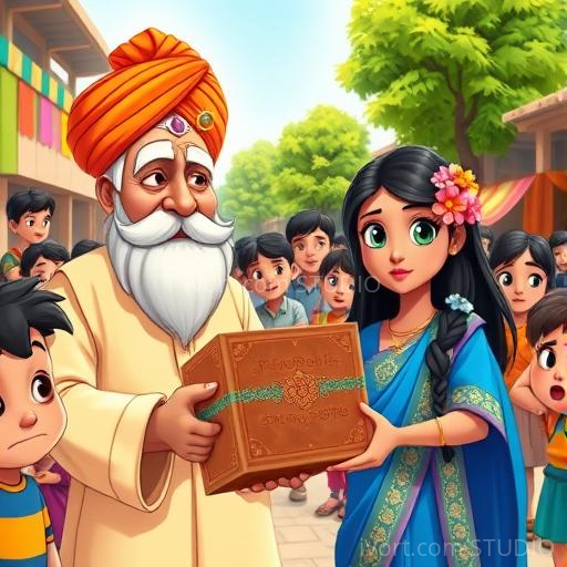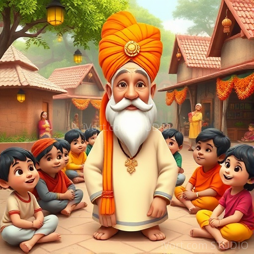 In a vibrant Indian village nestled between lush green fields and colorful markets, the villagers gathered around the wise Minister Raghunath. One day, he announced a special challenge: to find a treasure hidden somewhere in the village, but with a twist — only those who solve his puzzle can find it. Curious children and elders alike listened eagerly, their eyes shining with excitement. The air was filled with the aroma of jasmine and marigolds, and the sun cast a warm golden glow over the scene.