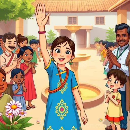 One clever girl named Anika, with big bright eyes and a traditional red bindi on her forehead, suddenly clapped her hands. 'It’s an echo!' she exclaimed. The crowd cheered, and the minister smiled warmly. 'Exactly right, Anika! An echo speaks without a mouth and hears without ears, coming alive with the wind.' The villagers clapped and cheered for her quick thinking, feeling proud of their young genius. The mood was joyful, and everyone felt a little wiser.