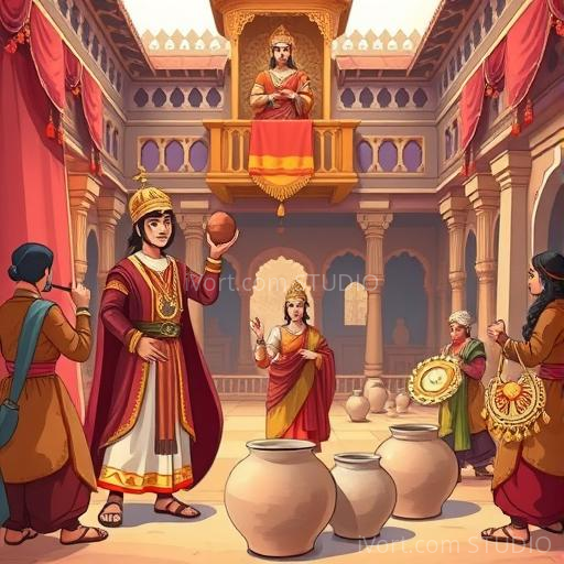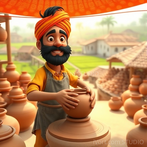 In a vibrant Indian village nestled between lush green fields and colorful markets, lived a humble potter named Ramu. One day, while shaping a beautiful clay pot under the warm sun, he heard a royal announcement: the prince was coming to visit the village! Ramu’s heart fluttered with excitement and nervousness. He wondered if his simple pots could impress the prince and bring honor to his humble workshop.