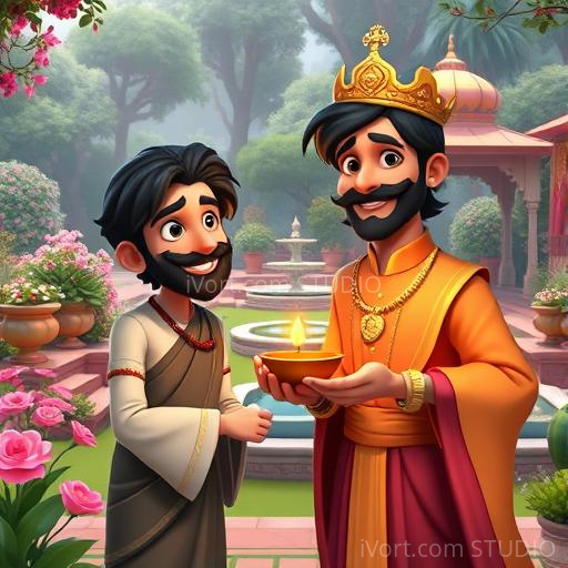 On the day of the prince’s visit, Ramu presented his simple diya with a shy smile. The prince was touched by the sincerity and love that shone through the humble pot. He lit the diya and smiled warmly, saying, ‘This is the most beautiful gift I have ever received, for it comes from the heart.’ Ramu felt proud and happy, knowing that true beauty lies in kindness and sincerity, not in riches or fancy designs.