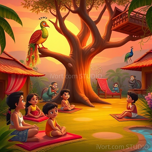One evening, as the sun dipped behind the hills, the talking tree decided to share a special story. It told Tenali about a brave peacock named Mithu who saved the village from a mischievous monkey. Mithu’s vibrant feathers shimmered like a rainbow, and his courage inspired everyone. As the story unfolded, Tenali listened intently, feeling the thrill of adventure and the importance of bravery and kindness. The villagers gathered around, enchanted by the tale that seemed to come alive in the glowing sunset.