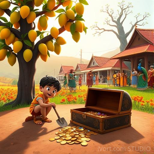 One day, the villagers faced a problem: their well’s water was drying up. The wise tree suggested a challenge—if someone could find the hidden treasure buried beneath the oldest mango tree, they would unlock a secret spring. Tenali eagerly accepted, feeling a surge of adventure. With the tree’s clues guiding him, he dug carefully, his heart pounding with excitement. Suddenly, he struck something hard—an old, decorated chest filled with sparkling jewels and ancient coins, promising to bring prosperity back to the village.
