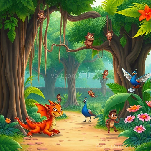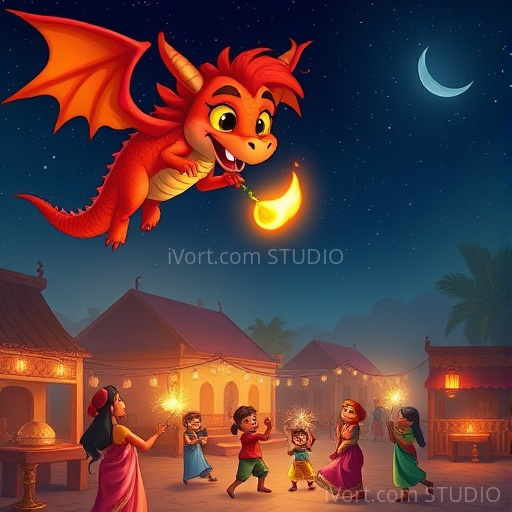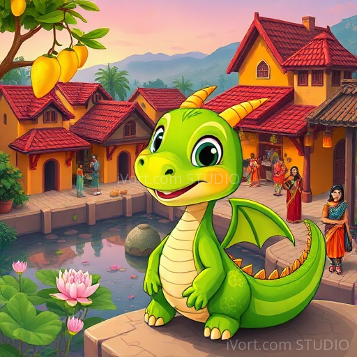 In a vibrant Indian village nestled between lush green hills and colorful bazaars, there lived a young dragon named Agni. Agni was famous for his fiery breath, which lit up the night sky during festivals like Diwali. One morning, Agni woke up feeling strange—his fire was gone! He looked at his reflection in the river, worried and confused. How could he shine like before without his fire? The villagers noticed his sadness and gathered around, offering kind words and encouragement. Agni decided he must find his fire again to bring joy back to his village and himself.