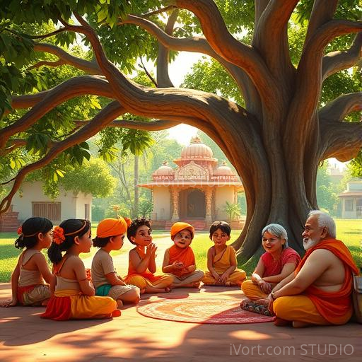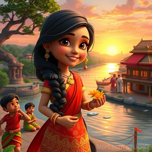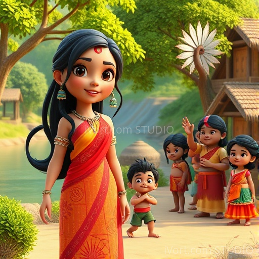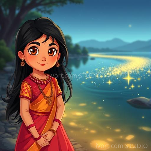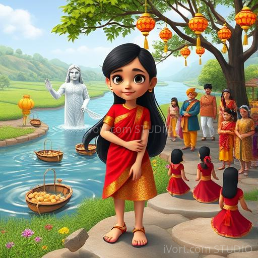 In a peaceful Indian village nestled between lush green fields and a winding river, young Anaya loved to play by the water's edge. One hot summer day, she noticed the river flowing strangely, swirling with a mysterious glow. Curious and a little worried, she decided to find out what was happening. Little did she know, the river was about to tell her a secret from long ago, reminding everyone of the importance of respecting nature.