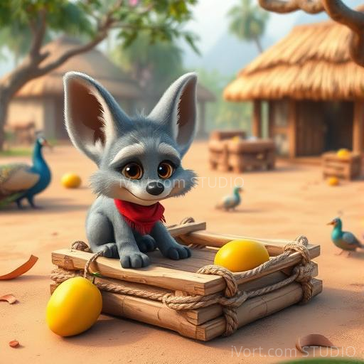 In a lush green jungle near an Indian village, a clever jackal named Chatur loved to explore and find tasty treats. One hot afternoon, Chatur heard a strange rustling sound and decided to investigate. As he tiptoed through the tall grass, he suddenly saw a big, shiny trap set by the villagers to catch a wild animal. The trap had a heavy wooden door, a snare, and some fragrant mangoes nearby. Chatur’s eyes sparkled with curiosity, but he knew he had to be careful. He wondered how to outsmart the trap without getting caught.