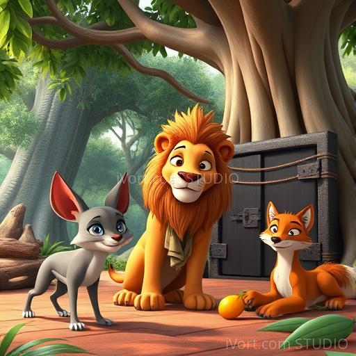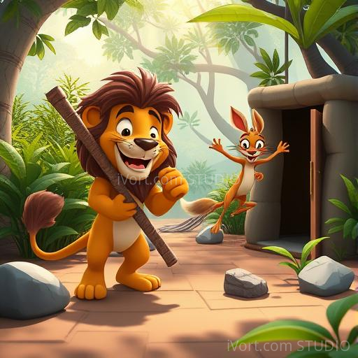 Raja the lion thought deeply and then whispered his plan. 'We will use a strong stick and some stones. Chatur, you will distract the trap by making noise, while I hide behind the bushes. When the trap is triggered, I will gently push the door open with the stick, and we will free the trapped animal.' Chatur nodded excitedly. With teamwork and cleverness, they prepared the tools and waited patiently. Soon, the trap was triggered by a curious squirrel, and Raja swiftly acted, freeing the tiny creature and saving the day.