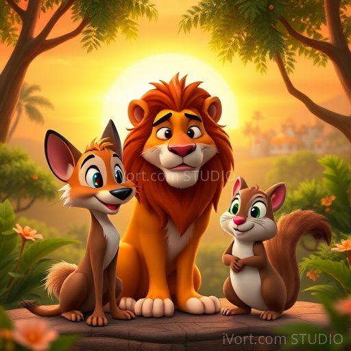 After the rescue, all the animals cheered and thanked Raja and Chatur. The squirrel scampered happily into the trees, safe and free. Chatur looked at his friends and said, 'Being clever and working together helps us stay safe and happy.' The lion nodded wisely, reminding everyone that kindness and intelligence are the greatest strengths. From that day on, the jungle was a safer place, filled with friendship and clever ideas. And the villagers, seeing the animals’ teamwork, decided to set fewer traps and live peacefully with the jungle’s creatures.